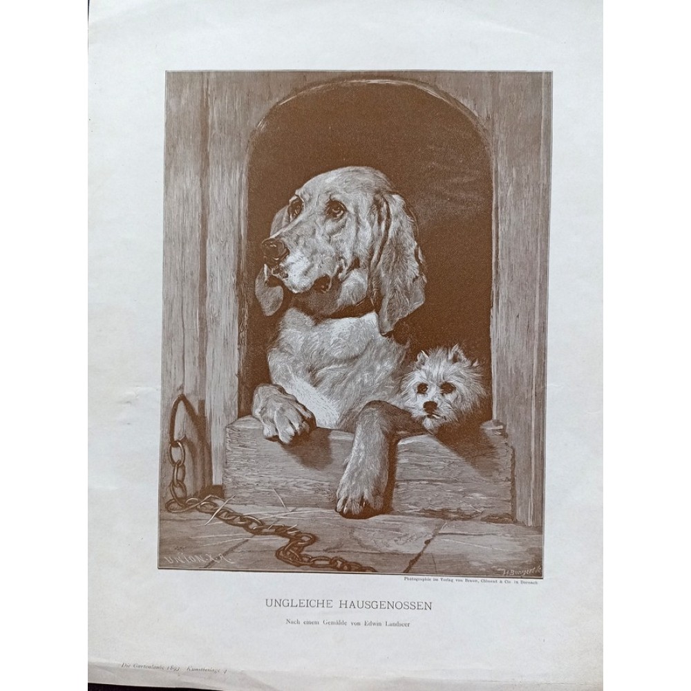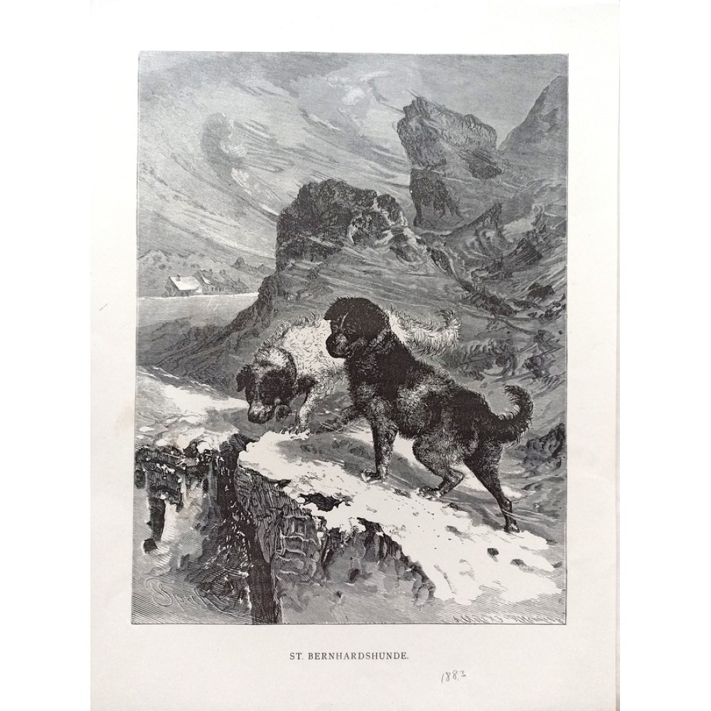 Antique lithographs depicting various dog breeds: dachshunds, terriers, St. Bernards, Weimaraners—German, 1880-1890.