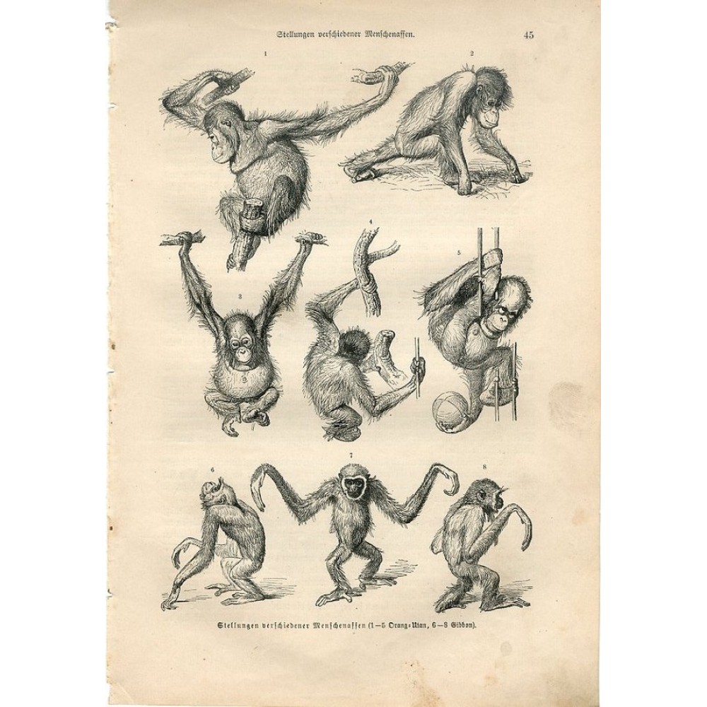 Monkey Ape Orangutan Gibbon - Original 1883 Engraving by A.Brehm. Fliegen und Schneckenblumen. Antique