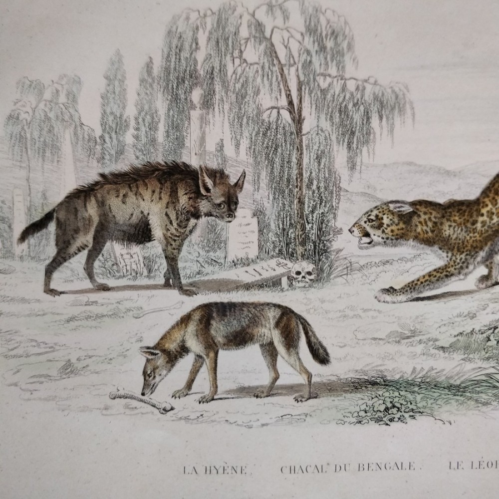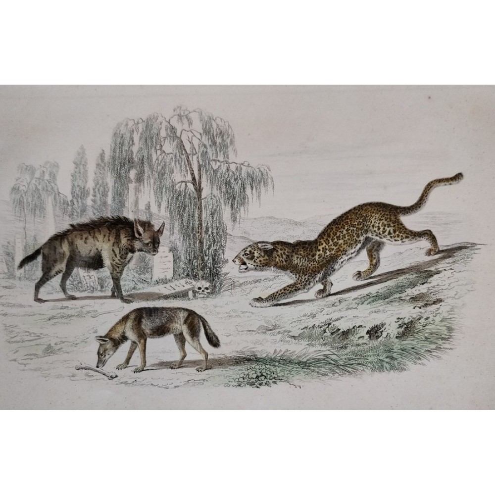 Antique engraving, 1890: Hyena, Jackal, Leopard.