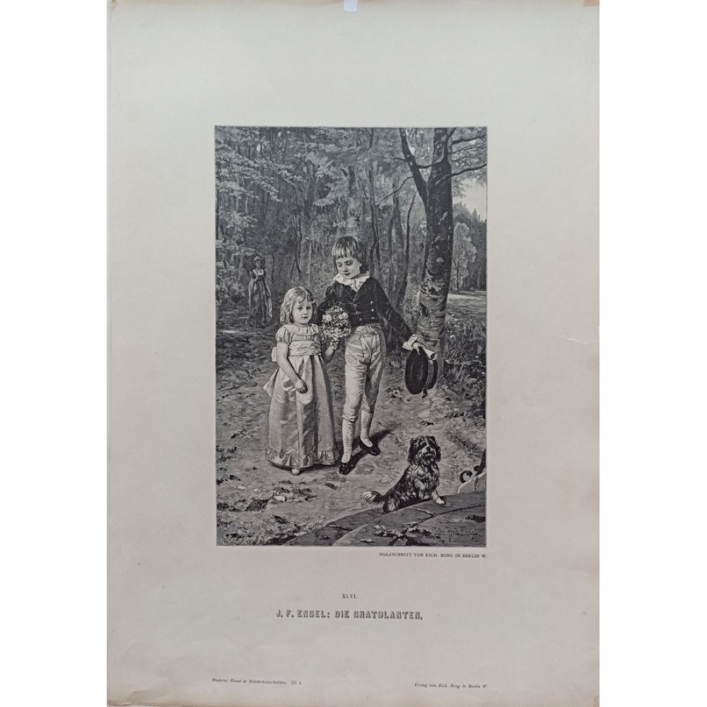 Antique lithograph, "Children with a Dog," printed between 1880 and 1890 in Germany.