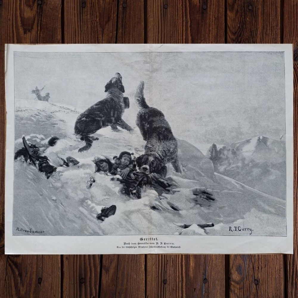 Antique lithograph of St. Bernards rescuing children in the mountains, Germany, 1880-1890.