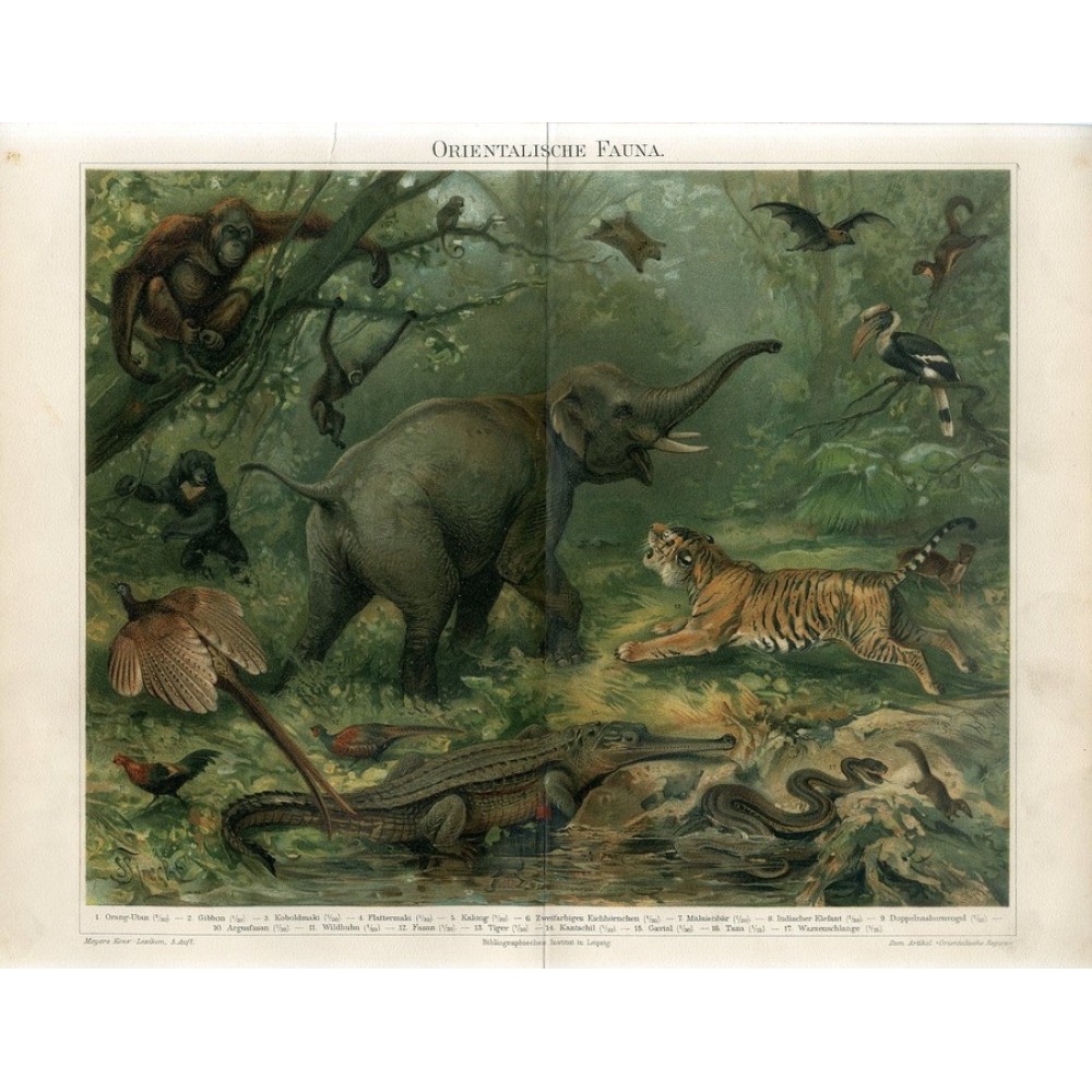 AW 8980 1895 TIGER ELEPHANT BAT CROCODILE ORANGUTAN TOUCAN PHEASANT JUNGLEFOWL Print Artist F.Specht.