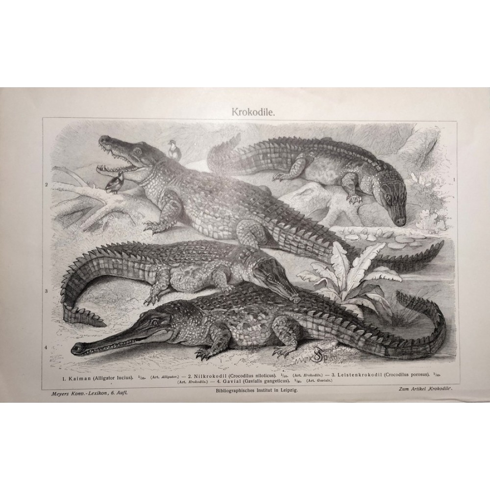 1895 Crocodiles Antique Print Chromolithograph German Natural History Illustration Brehm