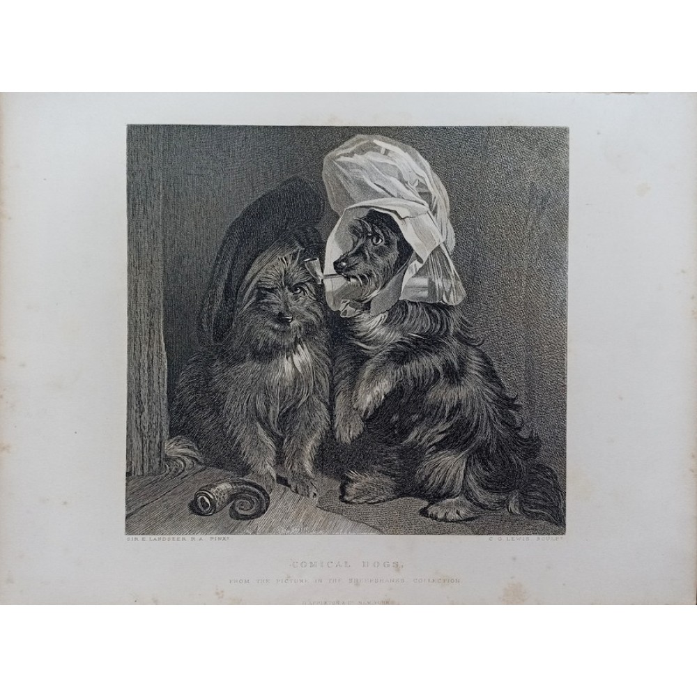 A wirehaired terrier with a horn tobacco box and Scottish bonnet; one wears a ladies cap.