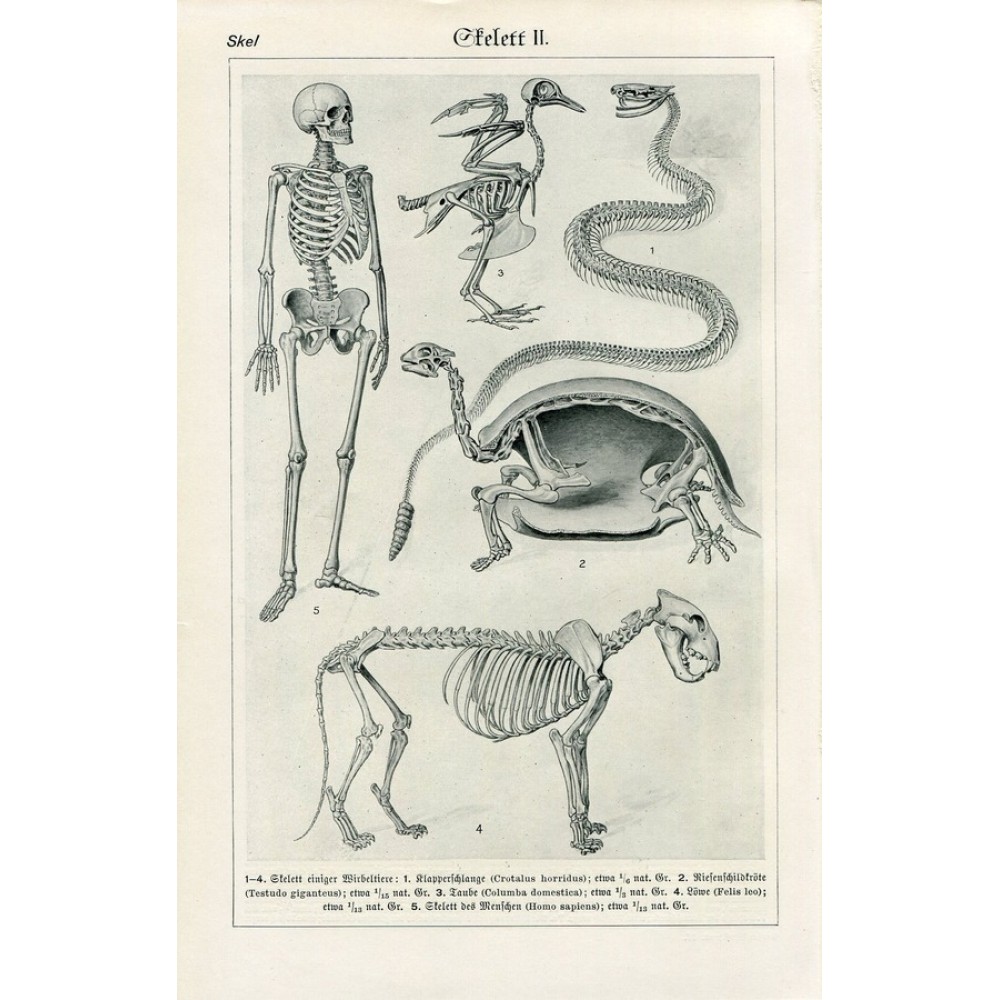 1895-SKELETONS-HUMAN-LION-PIGEON-TURTLE-RATTLESNAKE-Antique-Lithograph-Print