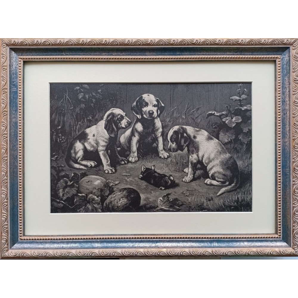 Antique lithograph "Puppies Watching a Mole," framed and matted, 1880s.