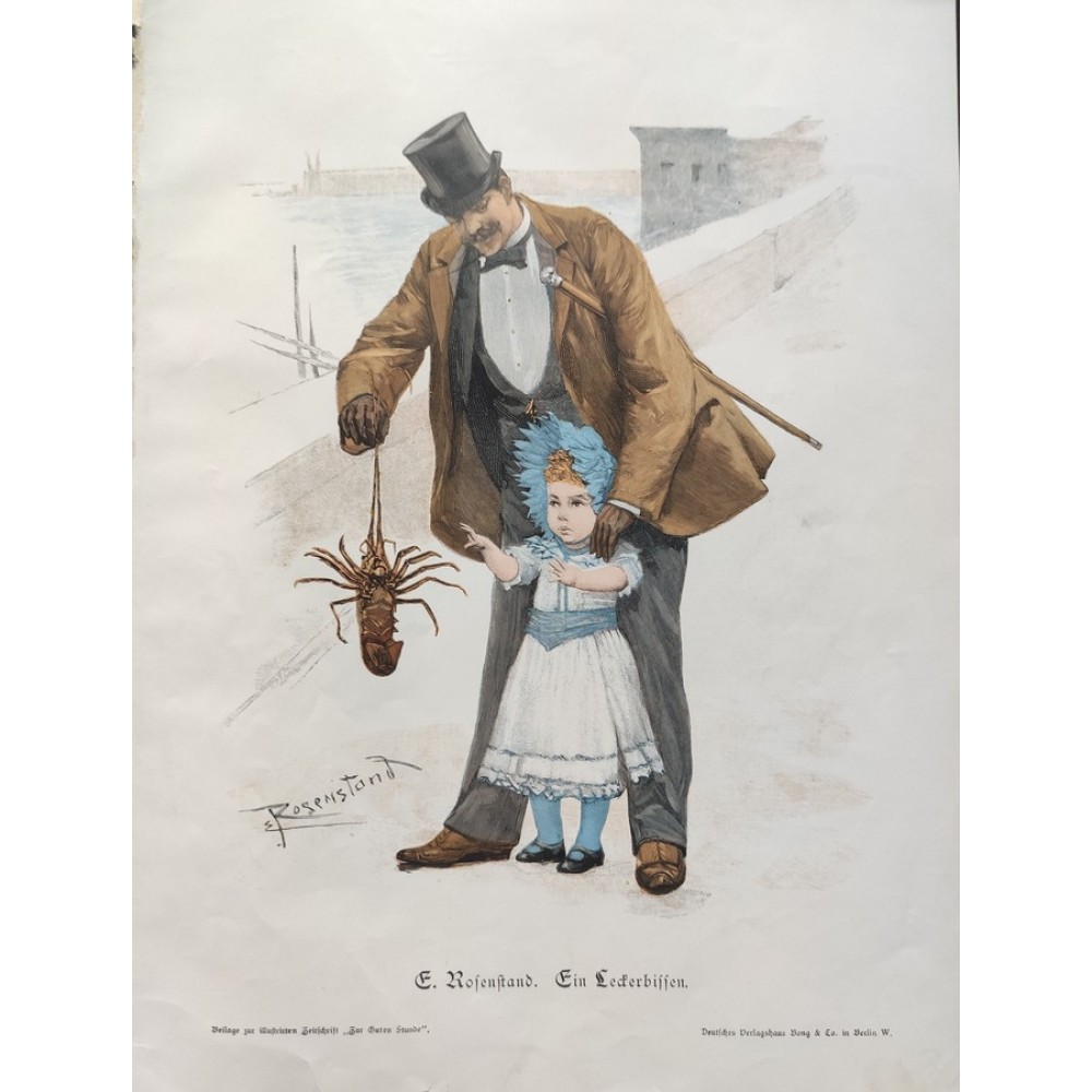 1894 Lobster Treat * Man And Girl *Antique Engraving Print *Child & Father* Lobster*A Tidbit * E Rosenstand*German Antique Print