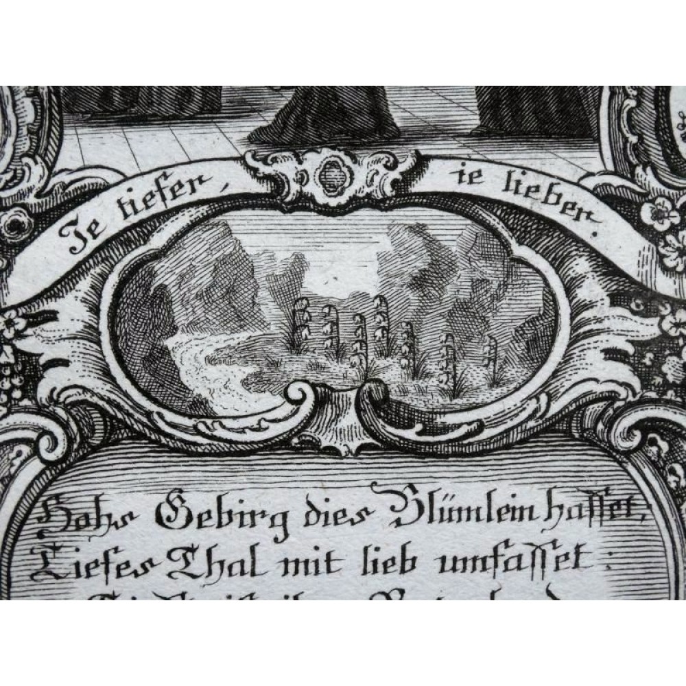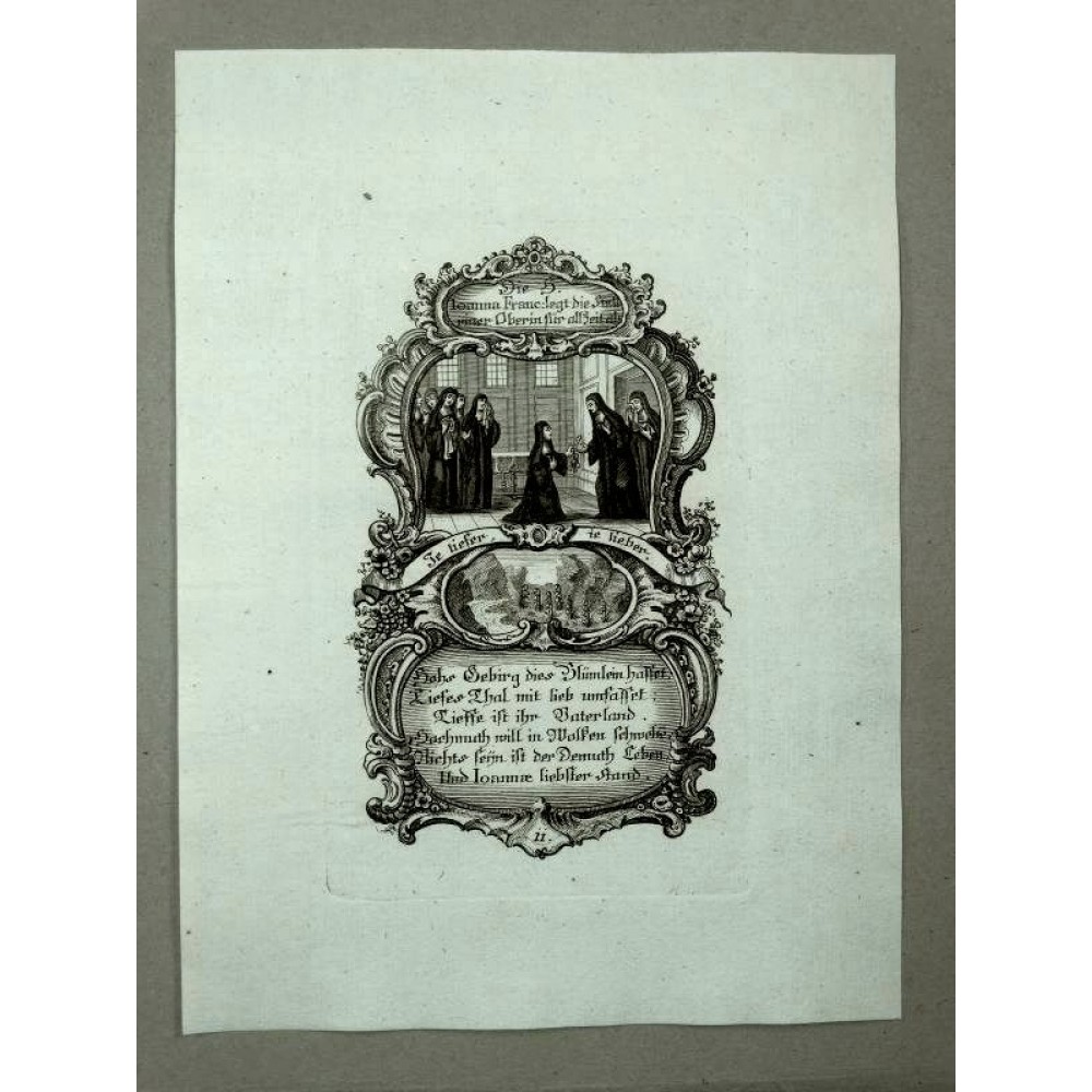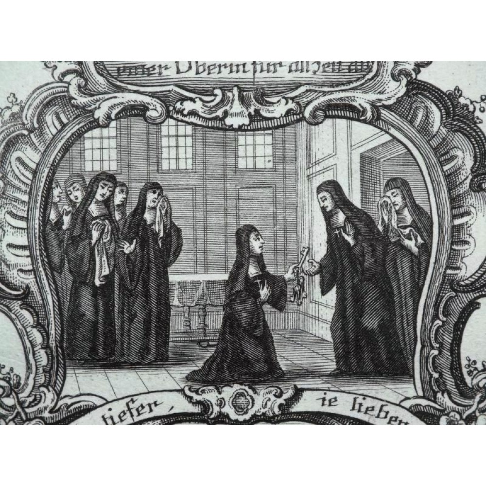 "Johanna Franziska von Chantal lays down the position of a Superior" Engraving by (Franz Xaver Jungwierth) after (Jg. Schilling) at (Franz Xaver Jungwierth), (circa 1760) Framed under glass Sheet size: approximately 23 x 17 cm View size: approximately 16 x 10 cm This sheet originates from a book. - slight signs of age - Further beautiful engravings from this series can be found in our current listings. A_MN