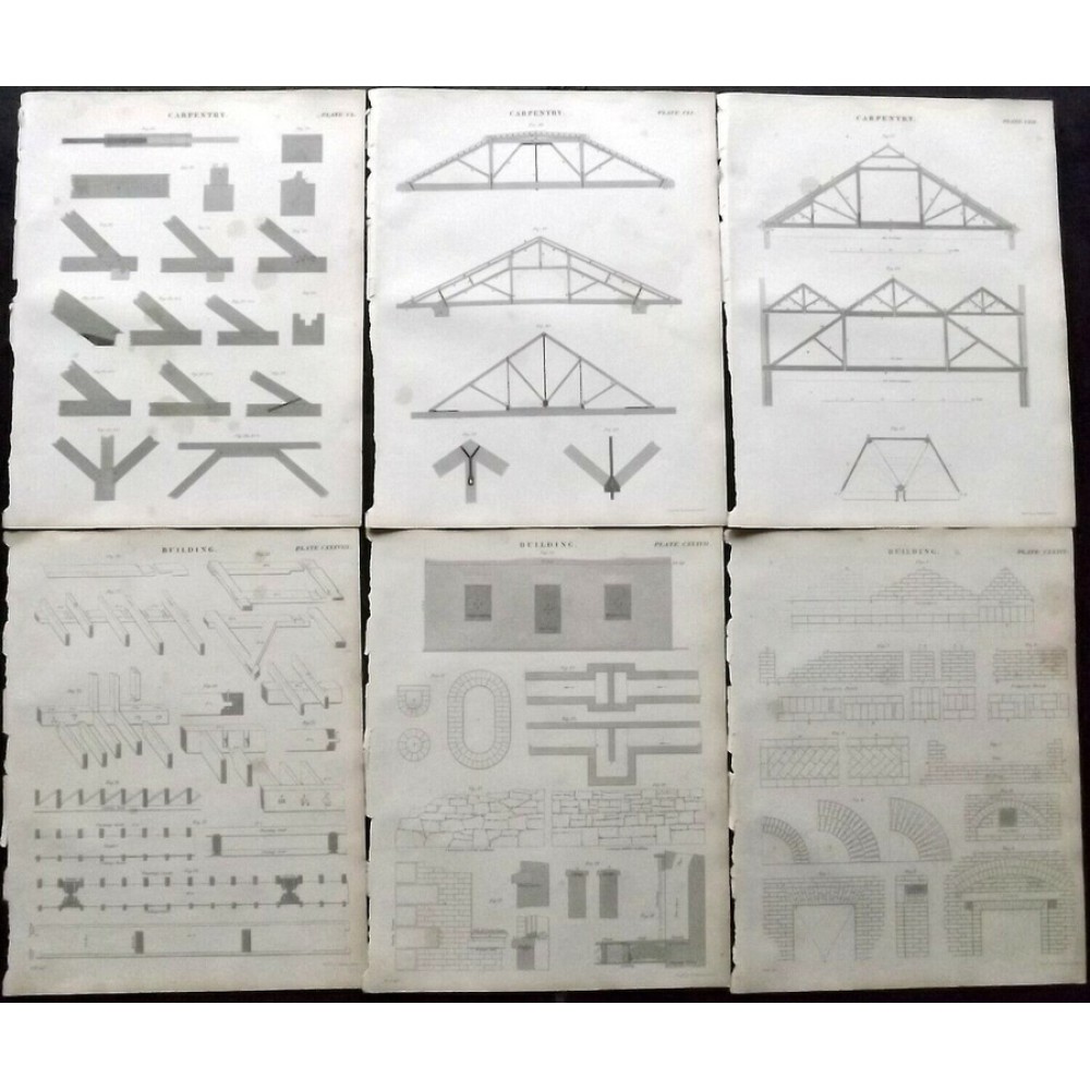 Encyclopedia Britannica C1830 Lot of 6 Prints. Building, Carpentry. Book Plates