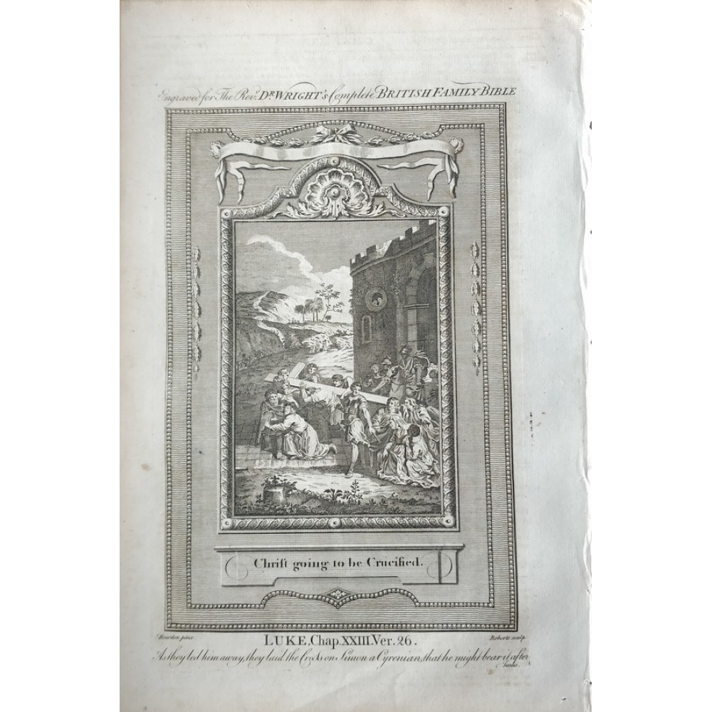 With Copper Plates This is the Christian's New and Complete British Family Bible: being a new, clear, full and universal exposition and commentary on the Holy Scriptures, illustrated with valuable notes and annotations. It was compiled by Paul Wright in 1792. it contains 80 copper Plates, and Maps;'Illustrated with most valuable notes and annotations, theological, critical, moral, divine, historical, geographical,., systematical, biographical, practical, admonitory, chronological and explanatory'. With a frontispiece and numerous further stunning plates throughout, including a depiction of the creation of Heaven and Earth, a new map of the garden and land of Eden, and other illustrations of Biblical text. 'All the difficult and obscure passages are clearly explained; the seeming contradictions in every respect reconciled; the mis-translations corrected; the errors of former commentators rectified and pointed out; the objections of deists and infidels answered; the prophecies and parables faithfully elucidated; sublimes passages properly noted; the offices of the Jewish and Christian churches thoroughly investigated; every minute circumstance of the revealed will of God faithfully recorded; all proper names together with scripture weights and measures, accompanied with the necessary interpretations and illustrations and the whole of divine revelation (upon which all our hopes of eternal happiness depend) displayed in its original purity, and rendered easy, pleasant, and profitable to every capacity, both with respect to faith and practice'. 'This valuable body of Christian divinity, and treasury of divine revelation, being the result of more than forty years study and experience (and not a hasty production, undertaken to serve pecuniary purposes) is executed in a manner far superious to other publications of this sort, and will alone form a complete universal library of divine knowledge, antient and modern'. Paul Wright was the vicar of Oakley and rector of Snoreham in Essex, previously of Pembroke Hall, Cambridge, an author of 'other learned, pious, and useful works, universally approved of by Christians of every denomination'.This Bible contains the Old and New Testaments with the Apocrypha bound between the Testaments. It is complete including frontis and title page. Bound in the original full leather binding , 6 raised bands on the spine. Original leather bound, untouched since 1st. printed; Published by Alex. Hoggs 1792 An extremely scarce copy of this large and engaging family bible.