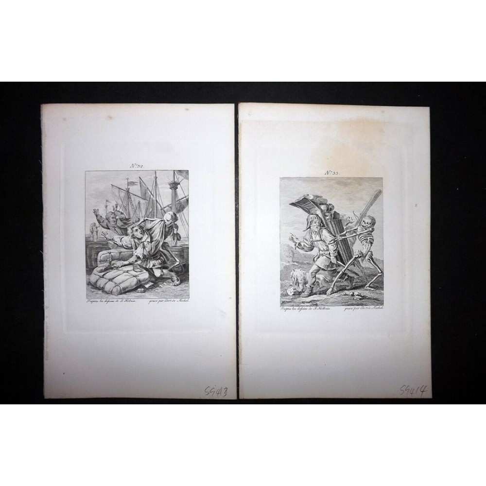 Holbein & Mechel C1870 Pair of Dance of Death Prints. Skeletons. Book Plates