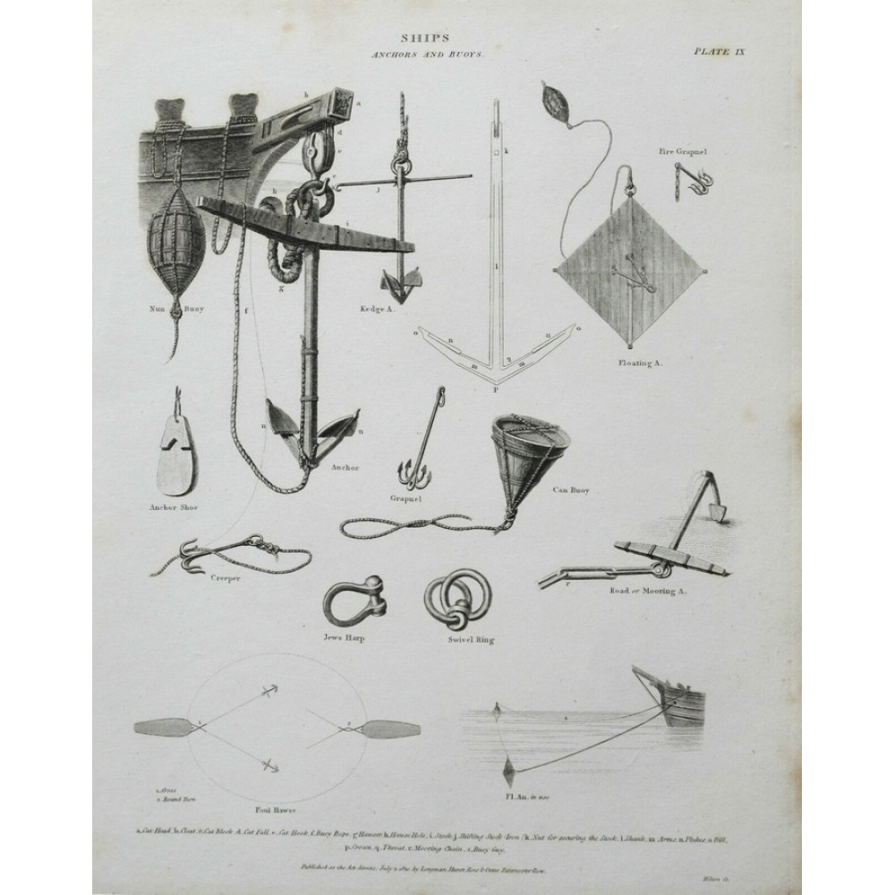 1810 Ships Anchors and Byoys Various Antique Print Engraving Rees