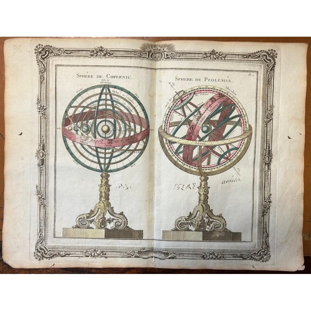 Description: Striking and highly detailed fine unusual 1766 Louis Brion de la Tour's copper engraved celestial chart featuring an Armillary Spheres. The sphere is surrounded by the representation of the Sun, the Moon, Mercury, Venus, Jupiter, Saturn, the Solar Systems according the theories of Copernicus & Ptolemy.