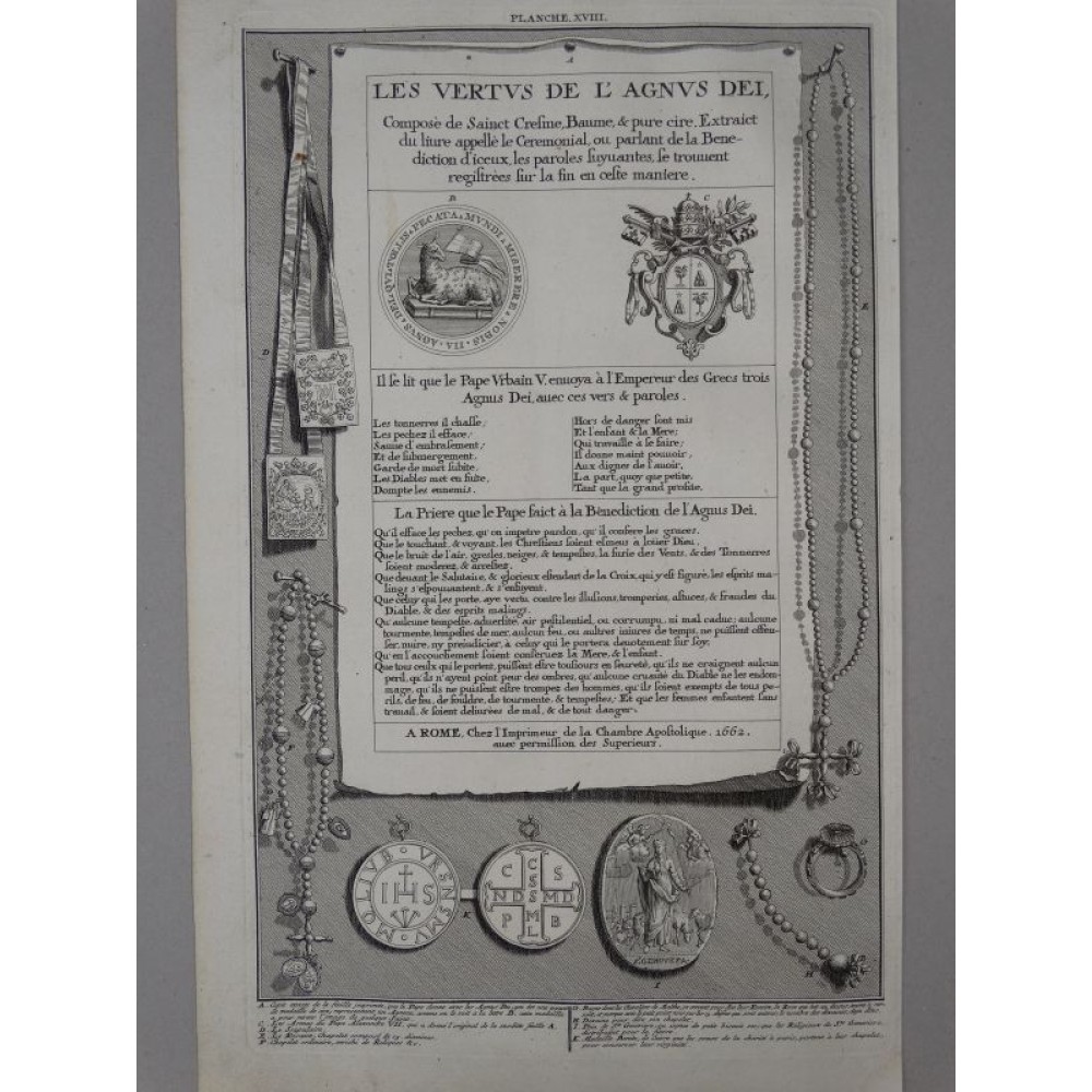 "Les Vertvs De L'Agnvs Dei..." copper engraving by D. Herrliberger, Zürich 1746, from the work: "Heilige Ceremonien und Kirchen-Gebräuche der Christen in der ganzen Welt." - Vol. 1 (v.3) in 4 parts.