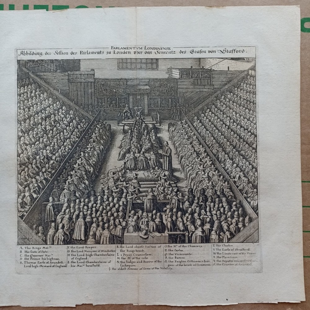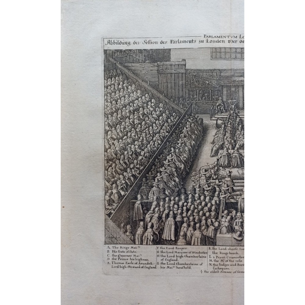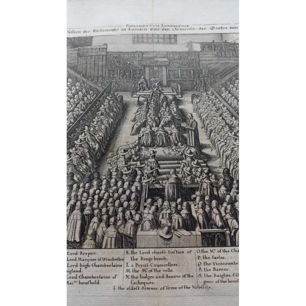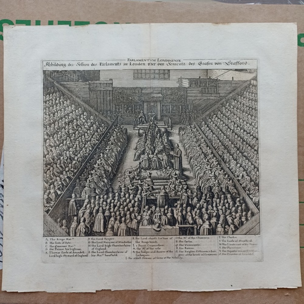 ANTIQUE COPPER ENGRAVED VIEW OF HOUSE OF PARLIAMENT Condition: --not specified Ended:Jun 11, 2022 , 7:03AM Winning bid: US $92.00 HOUSE OF PARLIAMENT TRIAL OF STRAFFORD LONDON ENGLAND 1630 HOLLAR ANTIQUE VIEW Description Parlamentum Londinense. Abbildung der Session des Parlaments zu London über den Sententz des Grafen von Stafford. Description: Striking and highly detailed interesting 1630 Wenceslaus Hollar's copper engraved sheet featuring the House of Parliament, London, during the trial of Strafford. The Earl is shown standing in the foreground seen from behind, wearing cloak and cap, facing judges and clerks in the centre and empty throne under canopy flanked by wooden boxes for king and spectators in the background; peers and members of parliament seated in tiers on both sides. The sheet is flanked with a key showing arrangement of court officials, attendants, etc. Date: 1630 ( undated ) Dimension: Plate size approx.: cm 37,1 x 33,7 Condition: Very strong and dark impression on good paper. Paper with chains. Map uncolored. Wide margins. Corners partially missing. Small foxing and browning. Small tear along the central fold, repaired on the verso. Map folded. Conditions are as you can see in the images. Mapmaker: Wenceslaus Hollar (23 July 1607 - 25 March 1677) was a prolific and accomplished Bohemian graphic artist of the 17th century, who spent much of his life in England. He is known to German speakers as Wenzel Hollar; and to Czech speakers as Václav Hollar. He is particularly noted for his engravings and etchings. He was born in Prague, died in London, and was buried at St Margaret's Church, Westminster. In the years 1627-8, active in Stuttgart; in the period 1629-30, worked for Jacob van der Heyden's publishing house in Strasbourg; in the years 1631-32, worked in various German towns including Frankfurt where he worked with Merian; 1633-36 resided in Cologne, employed by A.Hogenberg, visiting the Netherlands in 1634; 1636 joined the service of Thomas Howard, Earl of Arundel, with whom he travelled along the Rhine to Prague; December 1636, arrived with Arundel in London; 1644, to Antwerp after selling a number of plates to Peter Stent; 1652, returned to London, concentrating thereafter on book-illustration and cartography; 1666, named 'Scenographus regius' by the king but the Great Fire of that year brought to an end Hollar's projected view of the entire city; 1668-9, joined Lord Henry Howard on his expedition to Tangiers, but most of his late work consisted of routine illustrations for book publishers. Died in London in severely reduced circumstances. Оригинальное название:" Abbildung der Session des Parlaments zu London über den Sententz des Grafen von Stafford."