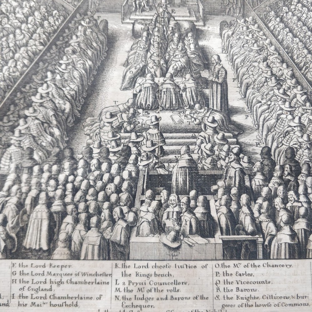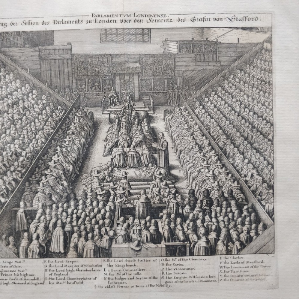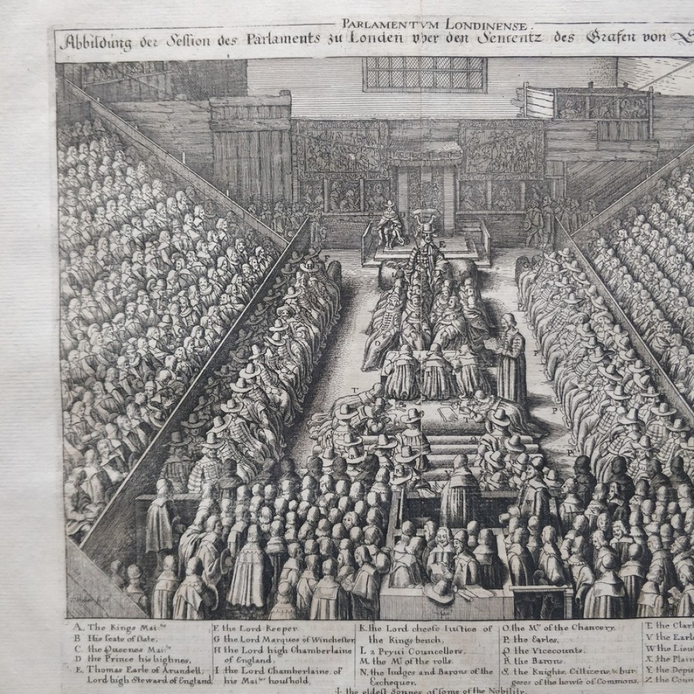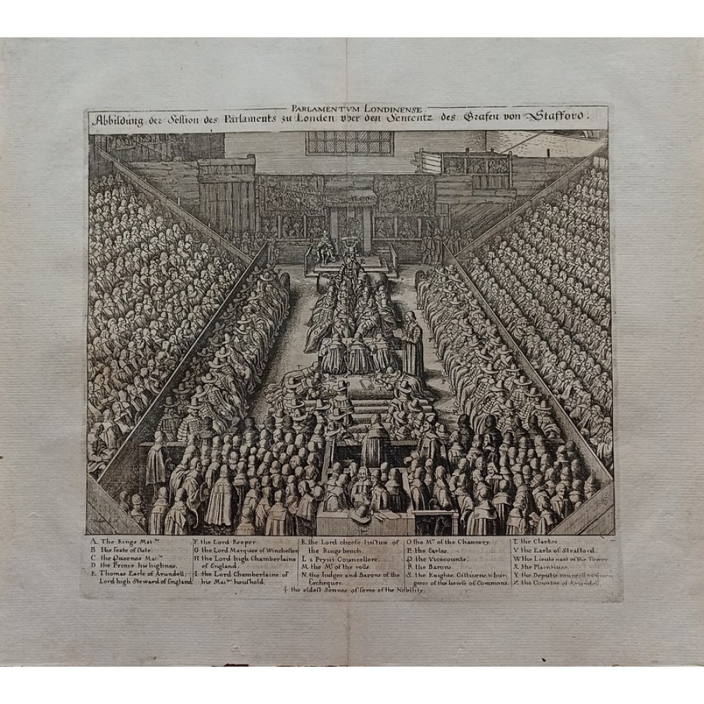 ANTIQUE COPPER ENGRAVED VIEW OF HOUSE OF PARLIAMENT Condition: --not specified Ended:Jun 11, 2022 , 7:03AM Winning bid: US $92.00 HOUSE OF PARLIAMENT TRIAL OF STRAFFORD LONDON ENGLAND 1630 HOLLAR ANTIQUE VIEW Description Parlamentum Londinense. Abbildung der Session des Parlaments zu London über den Sententz des Grafen von Stafford. Description: Striking and highly detailed interesting 1630 Wenceslaus Hollar's copper engraved sheet featuring the House of Parliament, London, during the trial of Strafford. The Earl is shown standing in the foreground seen from behind, wearing cloak and cap, facing judges and clerks in the centre and empty throne under canopy flanked by wooden boxes for king and spectators in the background; peers and members of parliament seated in tiers on both sides. The sheet is flanked with a key showing arrangement of court officials, attendants, etc. Date: 1630 ( undated ) Dimension: Plate size approx.: cm 37,1 x 33,7 Condition: Very strong and dark impression on good paper. Paper with chains. Map uncolored. Wide margins. Corners partially missing. Small foxing and browning. Small tear along the central fold, repaired on the verso. Map folded. Conditions are as you can see in the images. Mapmaker: Wenceslaus Hollar (23 July 1607 - 25 March 1677) was a prolific and accomplished Bohemian graphic artist of the 17th century, who spent much of his life in England. He is known to German speakers as Wenzel Hollar; and to Czech speakers as Václav Hollar. He is particularly noted for his engravings and etchings. He was born in Prague, died in London, and was buried at St Margaret's Church, Westminster. In the years 1627-8, active in Stuttgart; in the period 1629-30, worked for Jacob van der Heyden's publishing house in Strasbourg; in the years 1631-32, worked in various German towns including Frankfurt where he worked with Merian; 1633-36 resided in Cologne, employed by A.Hogenberg, visiting the Netherlands in 1634; 1636 joined the service of Thomas Howard, Earl of Arundel, with whom he travelled along the Rhine to Prague; December 1636, arrived with Arundel in London; 1644, to Antwerp after selling a number of plates to Peter Stent; 1652, returned to London, concentrating thereafter on book-illustration and cartography; 1666, named 'Scenographus regius' by the king but the Great Fire of that year brought to an end Hollar's projected view of the entire city; 1668-9, joined Lord Henry Howard on his expedition to Tangiers, but most of his late work consisted of routine illustrations for book publishers. Died in London in severely reduced circumstances. Оригинальное название:" Abbildung der Session des Parlaments zu London über den Sententz des Grafen von Stafford."