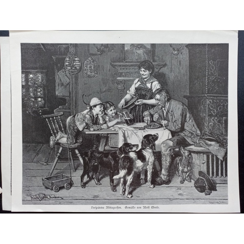 Authentic antique lithograph "Family Dinner" (Dogs. Dachshunds. Setters), c. 1890.