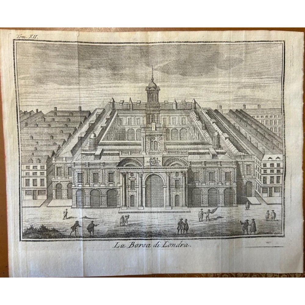Description: Striking and highly detailed interesting 1754 Thomas Salmon's copper engraved view of London Stock Exchange (LE), a stock exchange in the city of London, England, United Kingdom. Several inhabitants adorn the view.